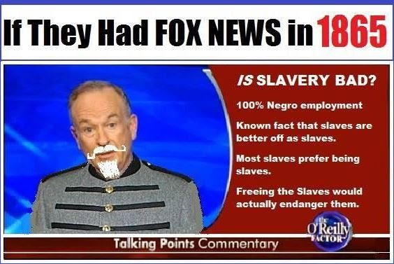Evidence; happy darkies singing in the fields. I ask you, would they sing if they were unhappy? No! There's proof that slavery is not bad. (1865 Bill O'Reilly)